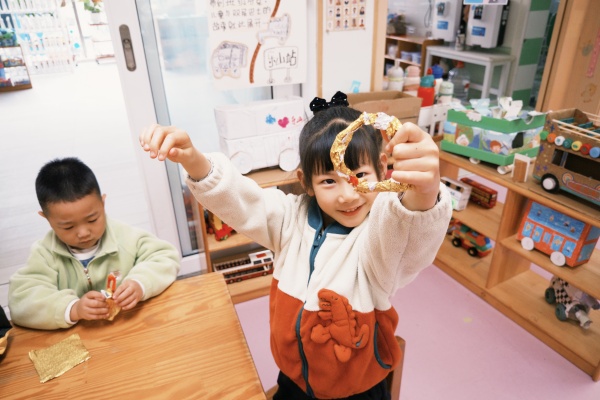 在总园,孩子们化身“小小设计师”,用金黄的扭扭棒扭出独一无二的“黄金手镯”,用彩纸折叠出朵朵小花。从充满爱意的“马赛克杯垫”到私人定制的“姓氏手链”,从植物拓印的雅致丝巾到童趣盎然的“花花手提包”,每一份礼物都藏着孩子们最纯真的告白。