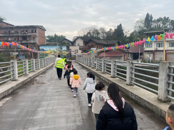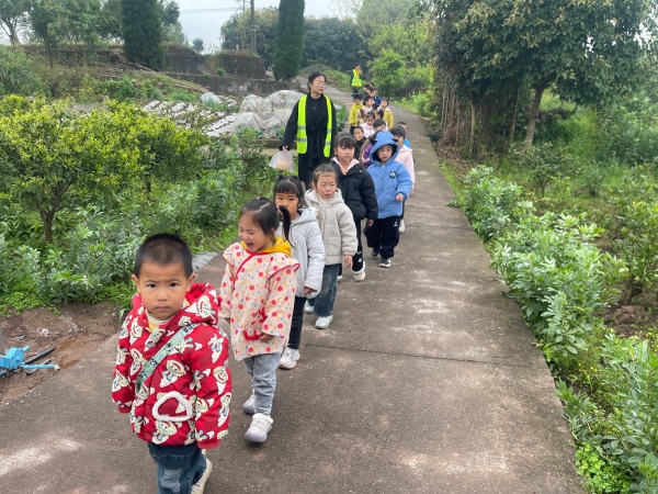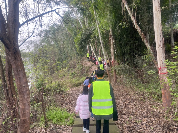 活动当日,孩子们在老师与协同人员的陪同下精神饱满、列队启程。一路上歌声与欢笑相伴,大家边走边观察抽芽的枝条、绽放的春花、嫩绿的草地,在行走中感受季节变换,用眼睛发现春天、用小手触摸自然、用童心聆听鸟语。