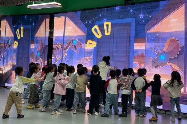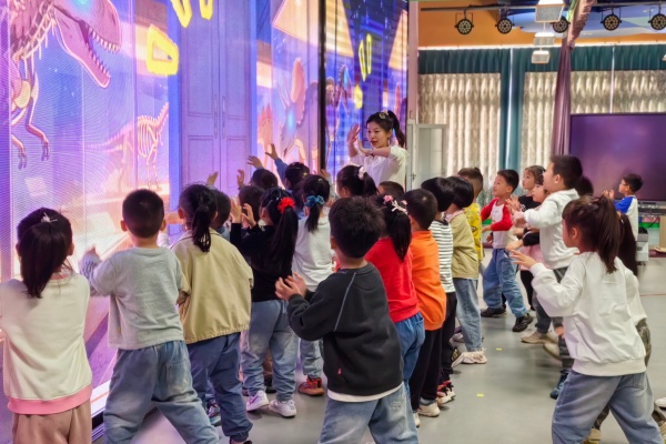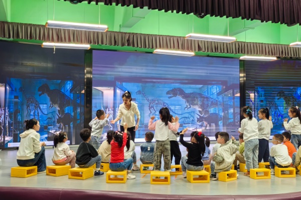 活动源于教师对幼儿兴趣的敏锐捕捉——将“参观博物馆”的真实场景与“恐龙复活”的奇幻想象相结合。教研团队围绕生活经验、音乐素养和游戏规则三条主线展开集体研讨。首次试讲中发现,常规椅背限制肢体表现、PPT缺乏动态感、教师戏剧张力不足。团队随即优化:更换无背椅、增加动态特效、强化情境引导。活动中,孩子们在“苏醒—觅食—奔跑—躲藏”的音乐游戏中自主创编动作,化身“小恐龙”随音乐变化灵活反应,专注力与规则意识明显提升,释放出丰富的想象力与表现力。