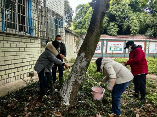 刷漆开始了,参与人员按支部划分责任区域:第一支部负责小操场至门卫室旁的树木,第二支部负责宿舍楼至食堂前的树木,第三支部负责食堂后至开心农场的树木。大家佩戴防护装备,细致刮除树皮老皮、重点覆盖树缝树杈,完工后有序回收工具、清理区域垃圾,各支部书记巡查验收,全程分工协作、干劲十足。