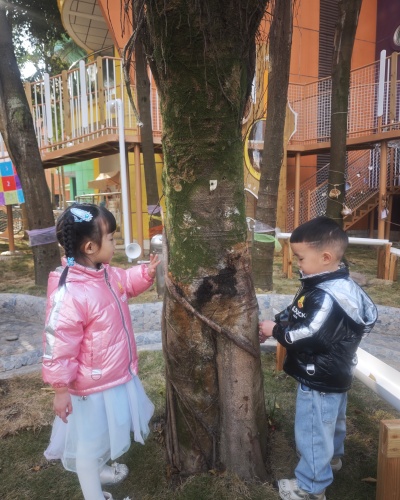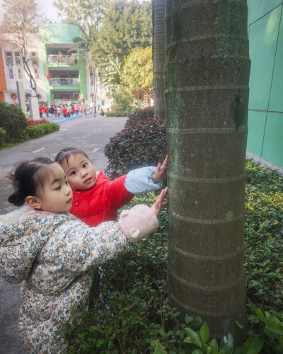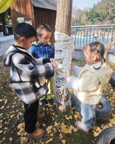 创作结束后,孩子们化身“树木小卫士”,捧着彩色绳子来到户外。他们踮着脚尖,认真地为树木缠绕绳子,动作轻柔又仔细。天天一边慢慢系着绳结,一边小声念叨:“冬天要来了,给小树穿上彩色的衣服,它们就不会冻着啦!我们以后都要好好爱护它们,不能随便抠树皮。”其他小朋友也纷纷附和:“对!要保护小树!”“让它们一直长得高高的!”孩子们的话语充满童真,却藏着对树木最真挚的爱护。