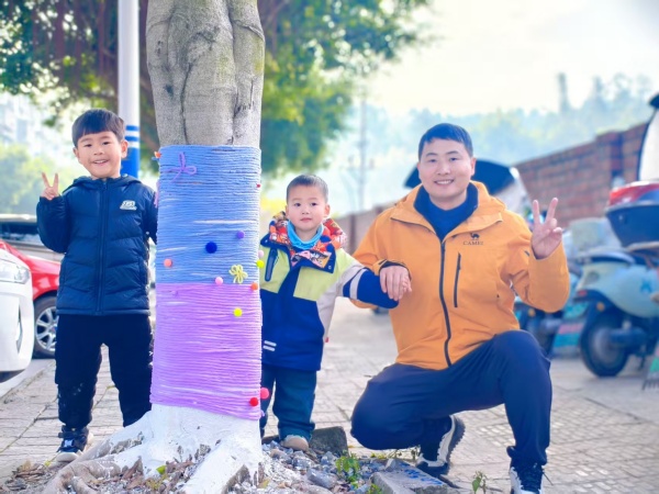 这一日,家长朋友和孩子们满怀热情,用温暖的手,“为大树妈妈编织美丽的衣裳”。他们用绒线、手工装饰和手工制作宣传卡片,为社区里的大树穿上“冬衣”,一双双小手轻轻抚过树干,一圈一圈仔细缠绕。一位小朋友边绕边说“要缠得紧紧的,这样风就吹不进去啦!”有蝴蝶结、彩条等装饰也被轻轻系上,大树穿上了孩子们精心设计的“花衣裳”。也在寒冷的冬日里播撒下爱与责任的种子,一张张充满童真的画作,承载着他们对大树的关心和对环保的理解。稚嫩的笔触下,是对自然的敬畏与守护的愿望。