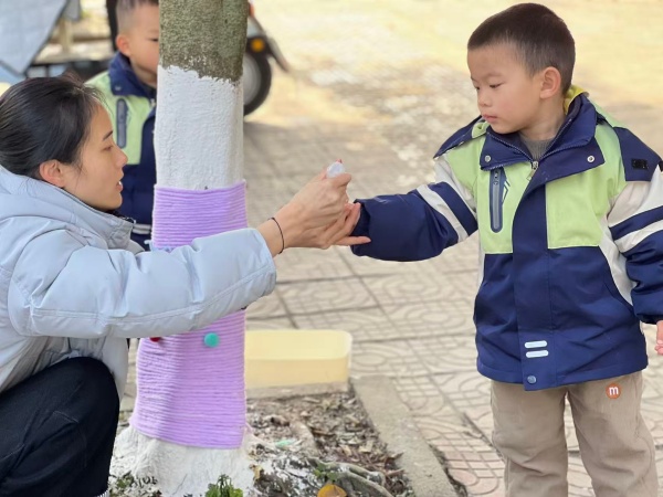 活动最后,孩子们纷纷拥抱自己装饰好的大树,小脸贴在绒线上,笑容如冬日暖阳。“咔嚓”一声,时光定格——树是沉默的巨人,孩子是活泼的精灵,他们在冬日里完成了第一次温暖的“拥抱”。