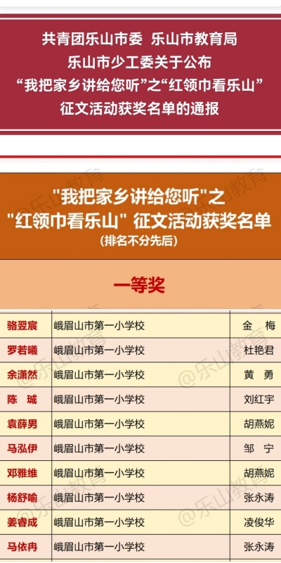 近日,共青团乐山市委、乐山市教育局、乐山市少工委联合举办的“我把家乡讲给您听”之“红领巾看乐山”征文活动落幕。峨眉一小学子大放异彩,一举拿下市级一等奖10名、二等奖16名、三等奖20名,获奖总人数稳居全市前列,学校获评“优秀组织单位”。