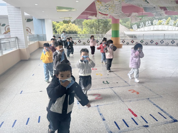 随着急促的消防警报声响起,各班教师迅速响应、分工明确、各司其职,严格按照演练方案,以班级为单位、沿既定路线,带领幼儿弯腰捂鼻、快速有序地向安全区域疏散撤离。
