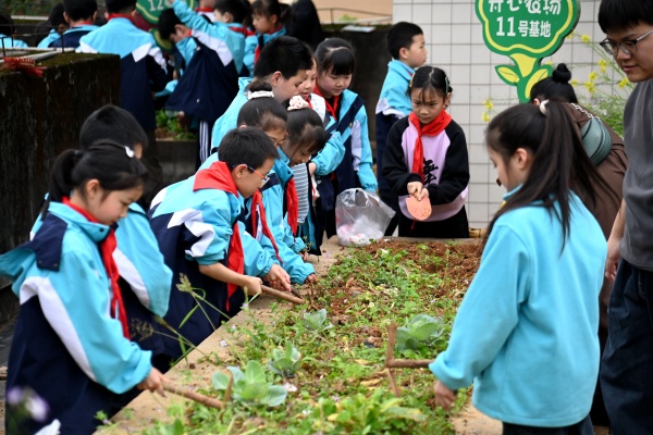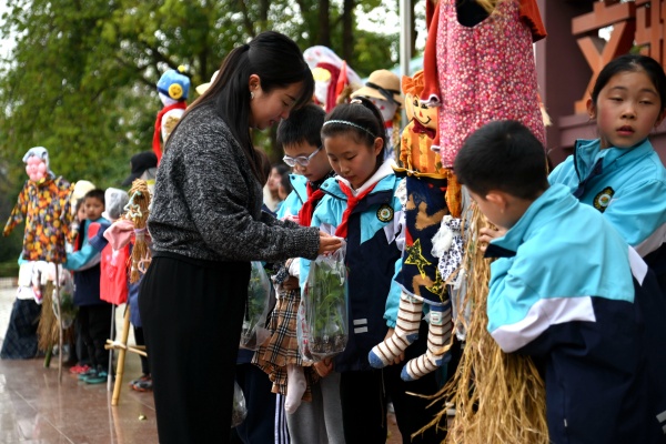 创意展示结束后,校长周雨松、副校长李秋梦为孩子们分发菜苗,各班学生在班主任及家长志愿者指导下,有序进入农场开展播种实践。孩子们分工协作、认真栽种,将菜苗与勤劳、合作、坚持的品质一同植入土壤。