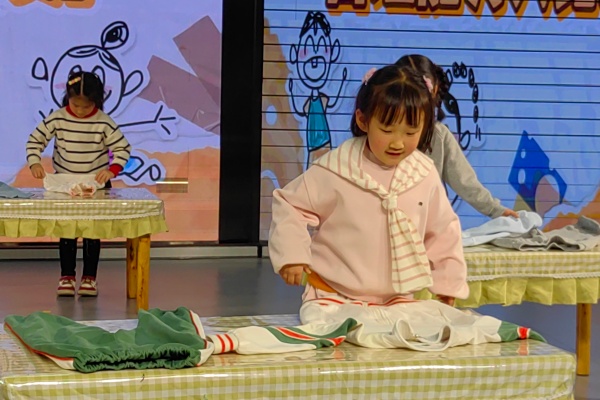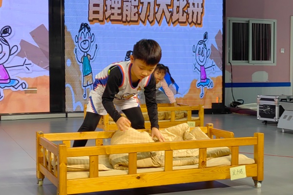 活动设置书包文具收纳、扣纽扣叠衣服、系鞋带、整理床铺四大挑战项目。比赛开始前,全体大班幼儿进行了活力热身,以饱满的精神状态迎接挑战。比赛过程中,孩子们神情专注、动作娴熟,有条不紊地将书包、文具、水杯分类摆放,快速将衣物叠放整齐,灵活地穿系鞋带,认真整理出方方正正的小床铺,充分展现了日常练习的成果,赢得了在场老师和家长代表的阵阵掌声。